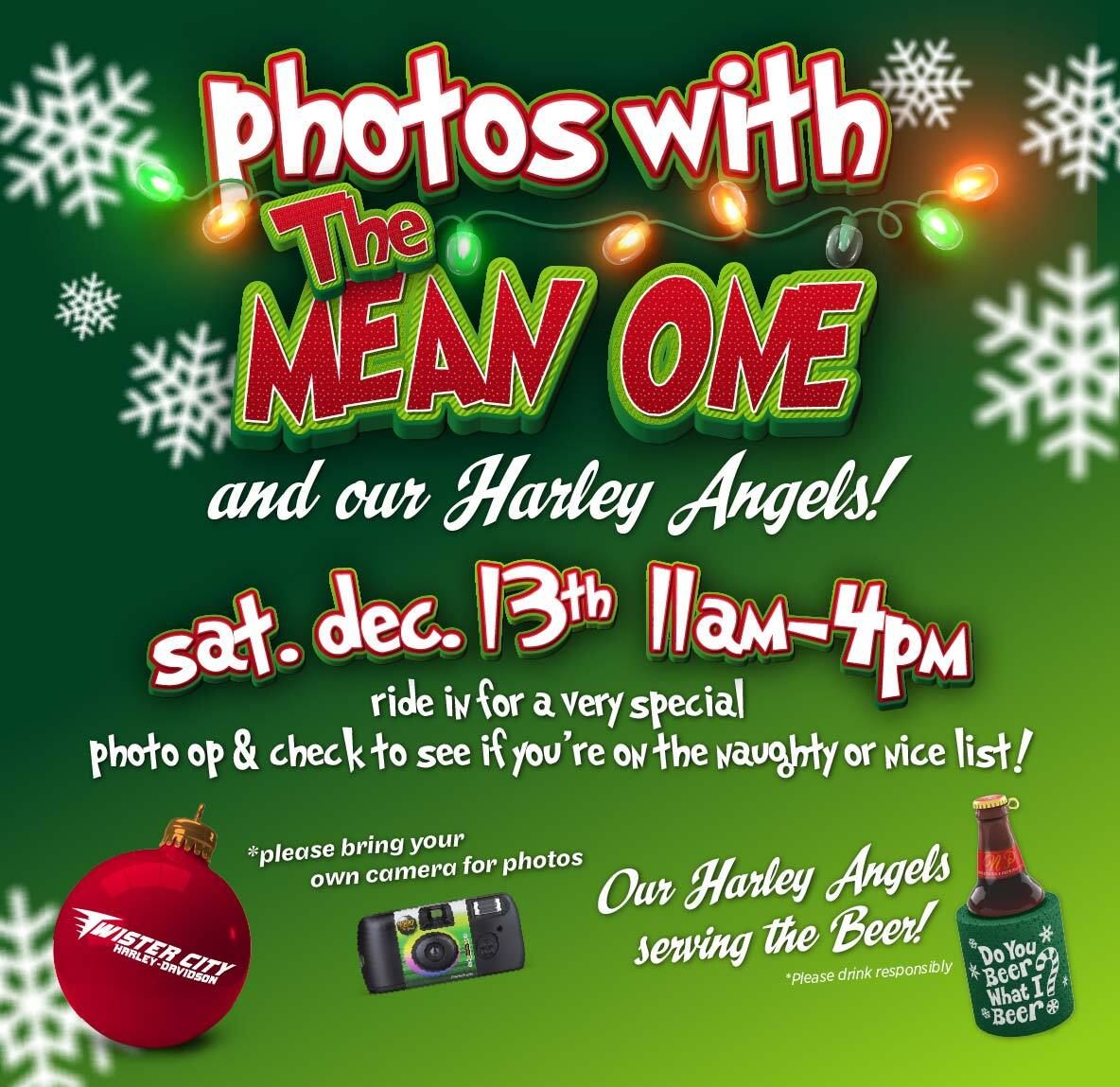 Join us for photos with the OG of Meanness (The Grinch) and our Harley Angels!