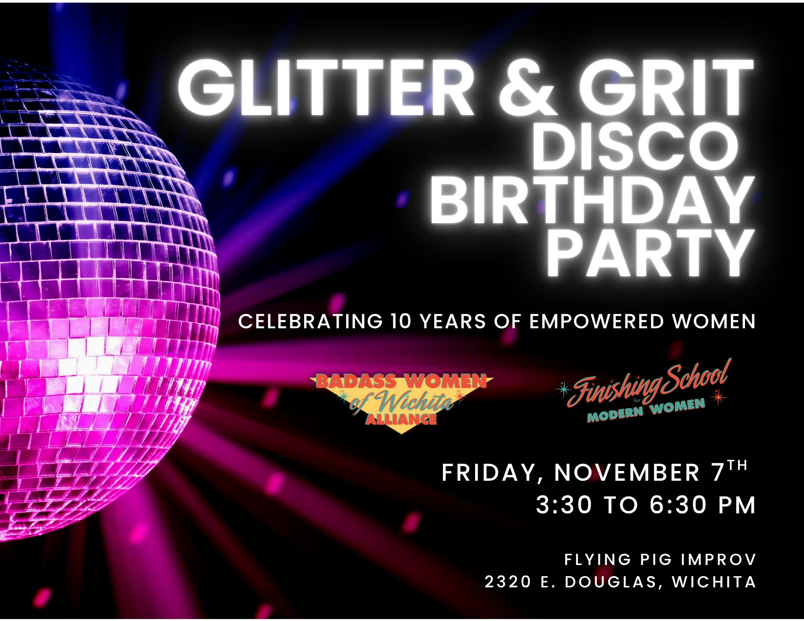 Celebrate a decade of empowerment at Glitter & Grit: Celebrating 10 Years of Empowered Women on Friday, Nov. 7, from 3:30–6:30 PM at Flying Pig Improv. Enjoy a funky disco bash filled with snacks, drinks, door prizes, and sisterhood as the Finishing School for Modern Women and Badass Women of Wichita Alliance toast 10 sparkling years of supporting women.
